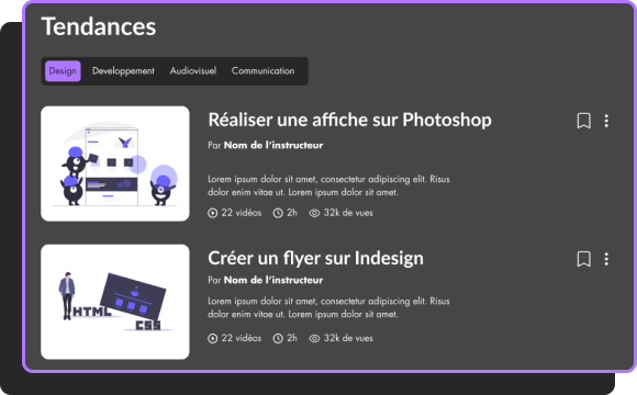 Vous aurez un large choix de parcours entre plusieurs catégories tel que design, audiovisuel, communication et développement. Les parcours vous permettront de réaliser l’objectif ciblé, tel la réalisation d’un site web, un montage simple sur Première Pro, le développement d’un petit jeu, etc..